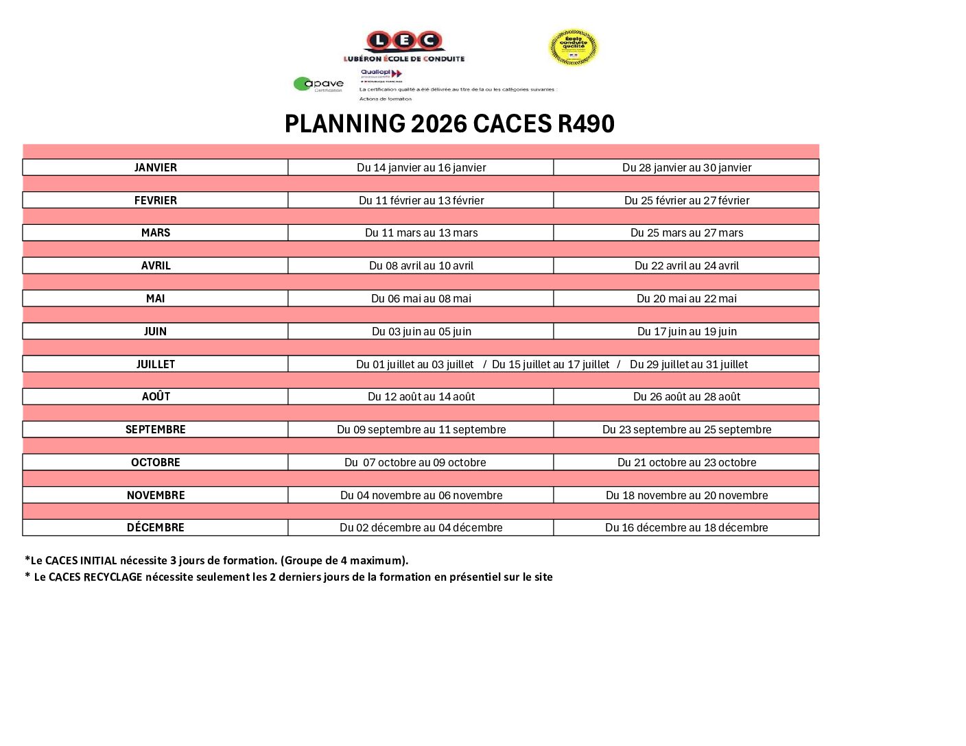 PERMIS A1/A2 – PERMIS BE – PERMIS C – PERMIS C1 – PERMIS CE – CACES® R489 cat. 1,3, 5 – CACES® R490
