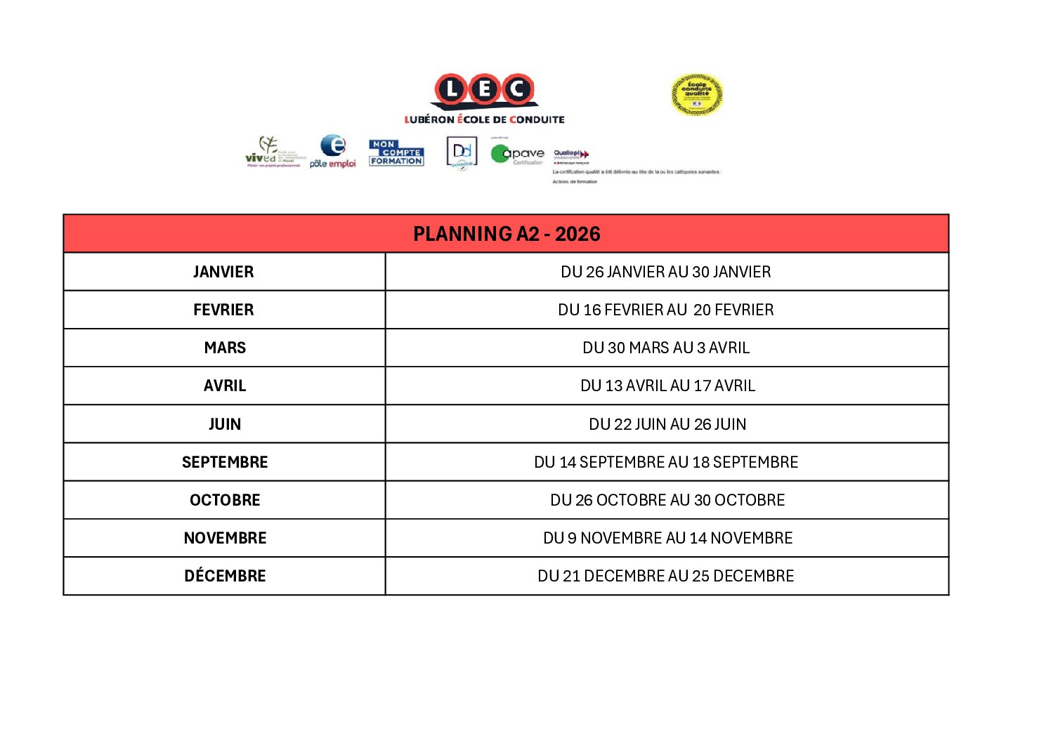 L’école de conduite LEC répond à ces critères de qualité : nous avons donc obtenu le label de qualité QUALIOPI. Nous pouvons donc réceptionner tous les financements provenant des organismes de formation.
