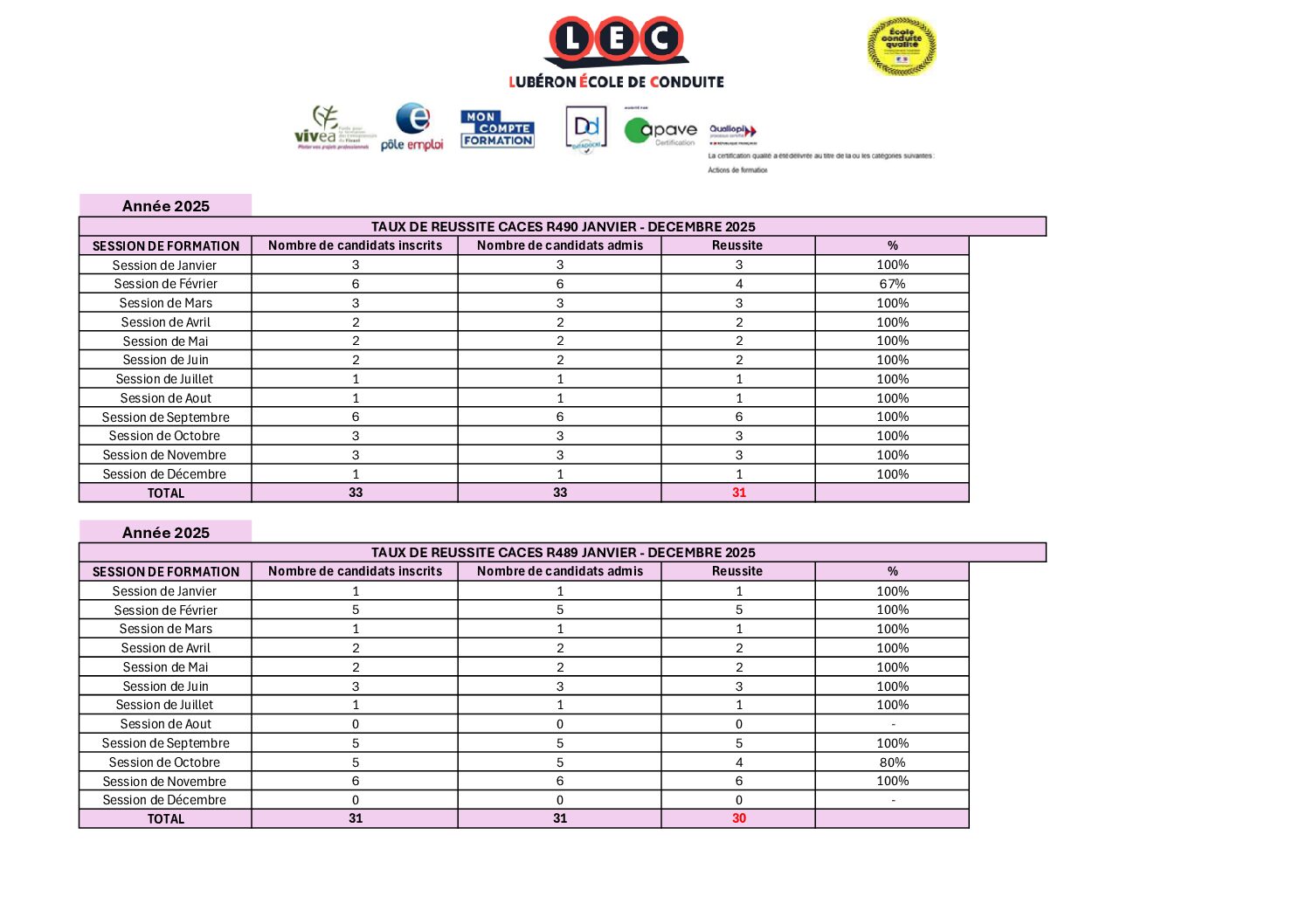 LEC LUBÉRON, École de conduite vous présente ses Taux de réussite au CACES R489 & R490 pour la période de janvier à décembre 2025.
